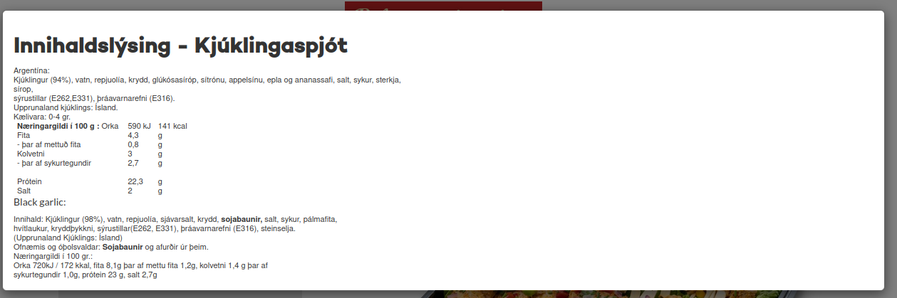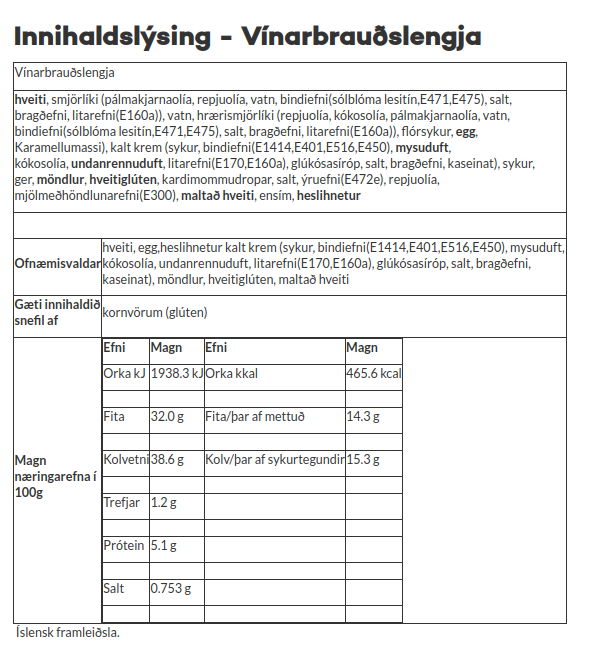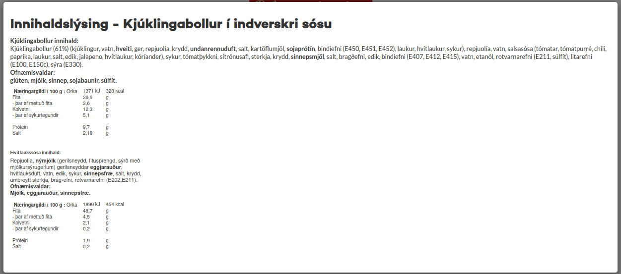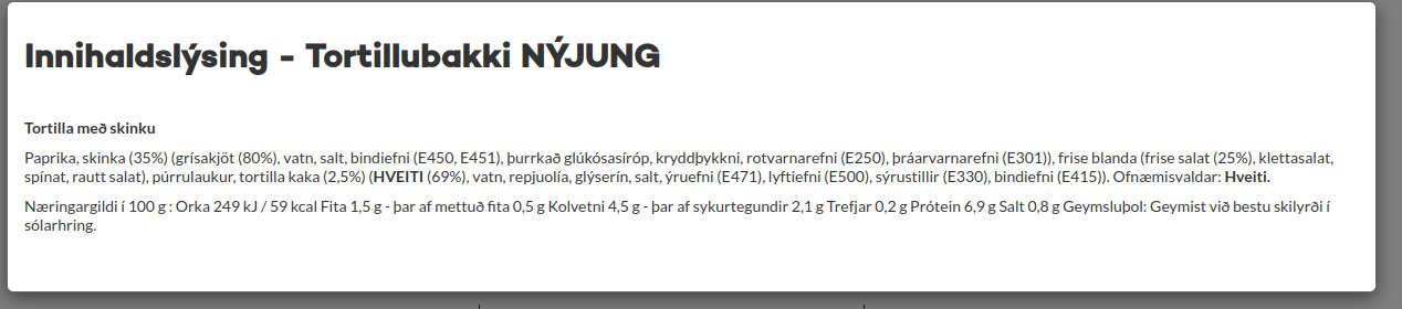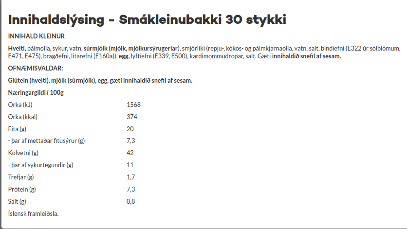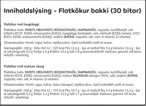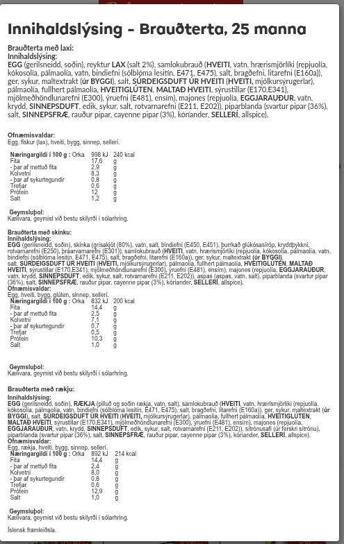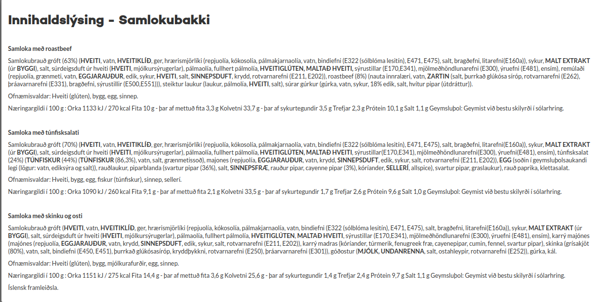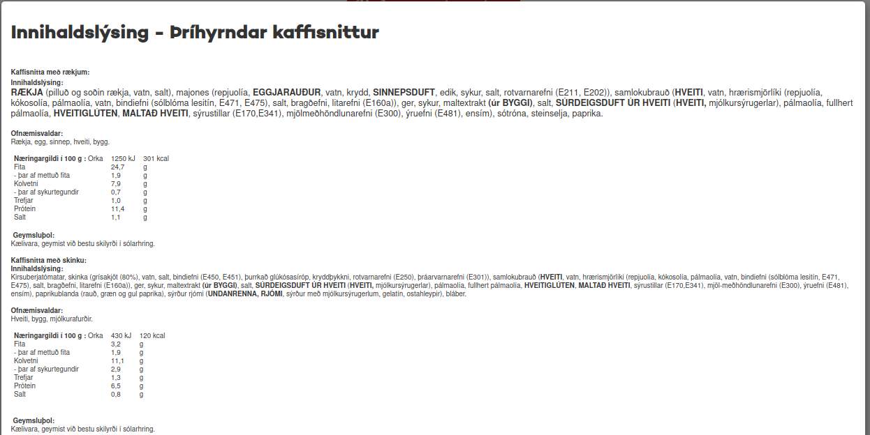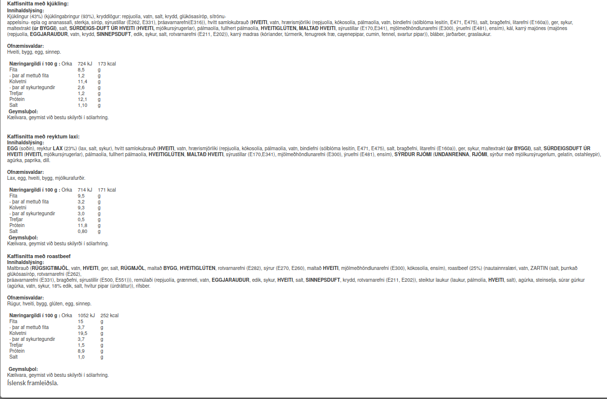 Sat: kleinur, vínarbrauð, flatkökur, brauðterta, kaffisnittur 1, kaffisnittur 2, tortillas, kjúklingaspjót.
